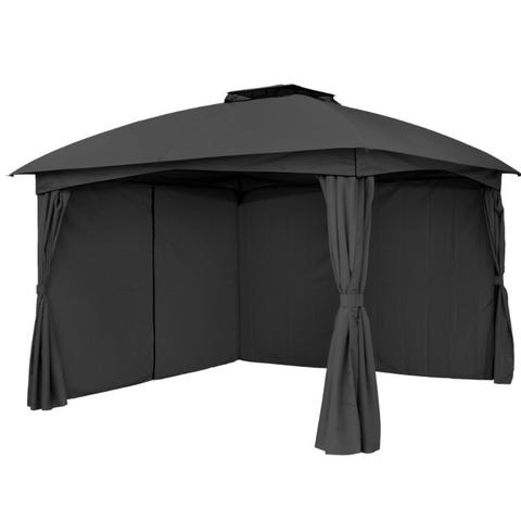 Robust och praktisk paviljong som skapar trivsel och skyddar mot sol, vind och regn. Med tillhörande sidostycken och förhänge samt myggnät. Storlek: 4x3 meter. Höjd 267cm. Robust metallram och sidor som kan fästas i hörnen för bättre luftintag. Taket är tillverkat av 220g/m² och sidorna från 160 g/m² vilket gör att den skyddar mot lätt sommarregn.