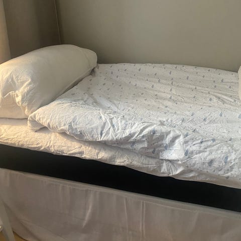Köptes 2023 och har stått i gästrum/lekrum sedan dess och väldigt sparsamt använd. Kontinentalsängen kommer med en madrassbotten och vi har köpt till ytterligare en madrassbotten för extra komfort.