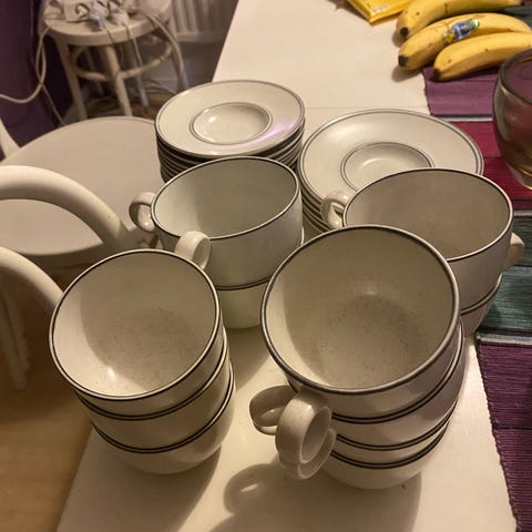 6 koppar, fat och assietter, 1 sockerskål.