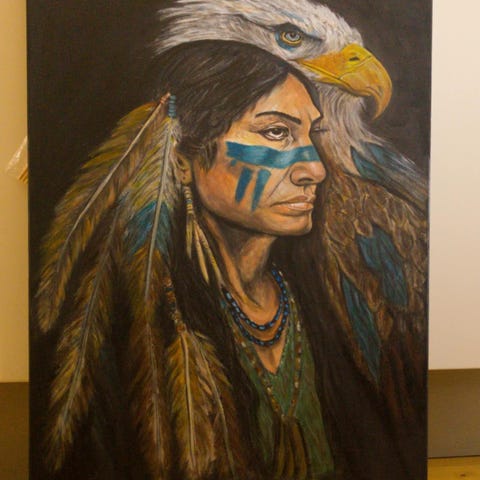 Målning med leopardmotiv i färgerna orange, svart, vit och grå. Målningen är 50 cm bred och 70 cm hög.