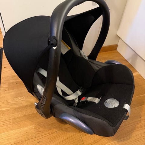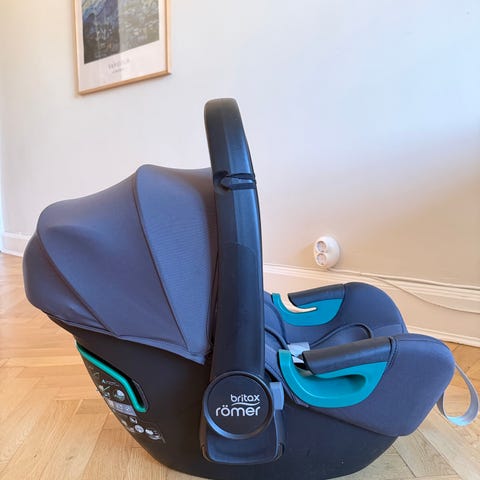Britax Römer babyskydd för barn upp till 13 kg. Bilbarnstolen är bakåtvänd och monteras i bilen tillsammans med tillhörande Isofix bas, som syns på bilderna. Babyskyddet har bärhandtag och sidokrockskydd samt stoppad insats för mindre barn. Klädseln är i svart tyg med blå detaljer. Passar som första bilbarnstol från nyfödd upp till cirka 13 kg, beroende på barnets längd och vikt. Basen ger en fast monteringspunkt i bilen och underlättar i- och urtagning av babyskyddet.