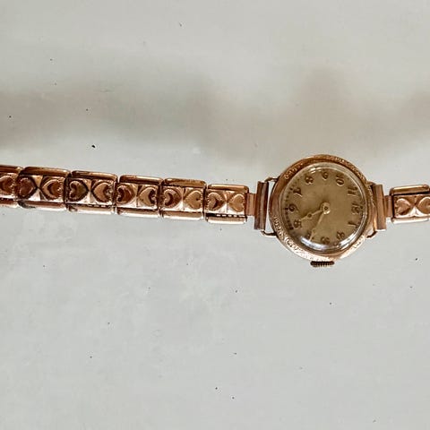 Imhof bordsklocka i mässing med rund urtavla och arabiska siffror. Klockan står på en rektangulär fot i mörk plast eller träimitation. Baksidan har manuella reglage för uppdragning och inställning. Klockan är mekanisk och saknar synlig elanslutning.