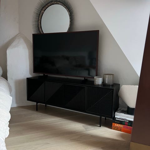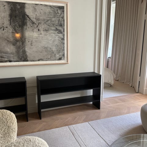 Svart byrå med stomme från IKEA samt front, dörrar, mässingknoppar och mässingben från Picky Living. Bakom varje dörr finns två hyllor (justerbar höjd). Mycket fint skick och väl omhändertagen.