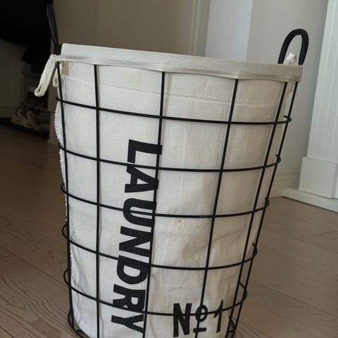 Hopfällbar tvättkorg i plast i grå och vit färg. Korgen har perforerade sidor och handtag på kortsidorna för enklare bärande. Den kan fällas ihop för platsbesparande förvaring när den inte används. Passar för förvaring och transport av tvätt eller andra hushållsartiklar.