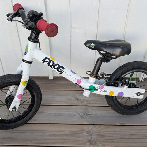 Balanscykel för barn med 12 tum hjul. Cykeln är lila med svart sadel och handtag. Utrustad med handbroms bak och luftfyllda däck. Ram i metall med låg instegshöjd som underlättar för mindre barn att kliva av och på. Passar som första cykel för barn som ska träna balans innan övergång till trampcykel.