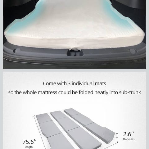 Original Tesla madrass för Model Y i svart. Setet inkl. en vikbar madrass anpassad för lastutrymmet, en hopfällbar förvaringsväska samt elektrisk pump med 12V-kontakt. Formskuren madrass som täcker hela lastgolvet med nedfällda baksäten. Pumpen har anpassat munstycke som passar madrassens ventil. Avsedd för användning i Tesla Model Y.