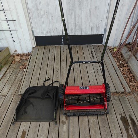 Handdriven gräsklippare i röd färg med uppsamlare. Modellen har två hjul fram och en uppsamlingskorg baktill för gräset. Passar för klippning av mindre till medelstora gräsmattor där man vill undvika motorljud och avgaser. Enkel konstruktion med handtag som skjuts framför användaren vid klippning.
