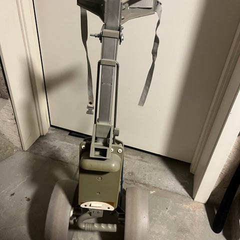 Happygolf Golfvagn med tre hjul i metallkonstruktion. Vagnen har handtag med remmar för att fästa golfbag samt elenhet monterad på stativet. Passar för transport av golfbag på golfbana.