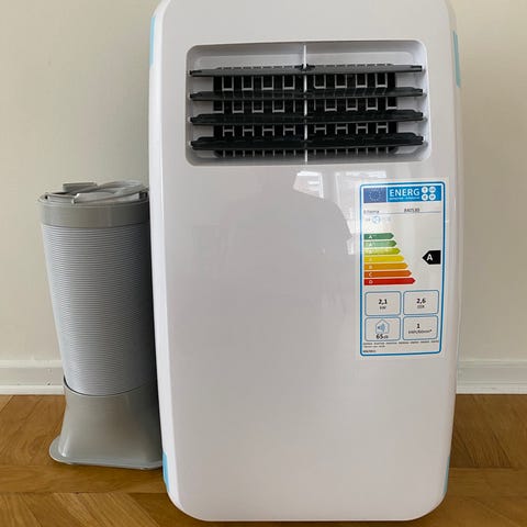 Sandstrøm portabel luftkonditionering i vit färg. Fristående enhet med utblås framtill och kontrollpanel på ovansidan med display och knappar för olika funktioner. Avsedd för inomhusbruk för kylning av rum. Ansluts till eluttag och har hjul för att kunna flyttas mellan olika rum. Passar exempelvis i vardagsrum, sovrum eller kontor där extra kylning behövs under varmare perioder.