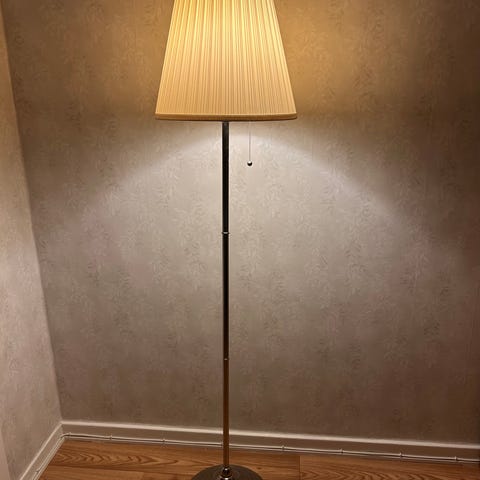 Lampan har måtten: höjd ca 150 med skärm (133 inkl bara glödlampa). Bredd på skärmen. ca 25cm uppe och 37cm nere. Pris: 600kr