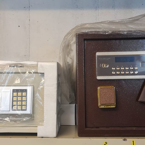 Skåpet har en fabrikskod som inte ska förvaras inne i skåpet. Det går även att ställa in flera egna koder.