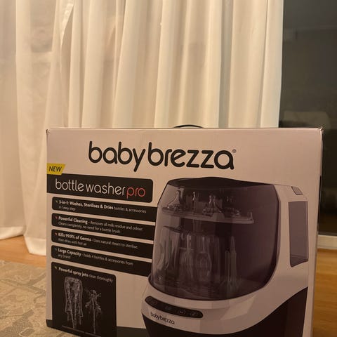 Baby Brezza sterilisator och tork för nappflaskor i vit och grå plast. Enheten har avtagbar behållare med flera insatser och ställ för nappflaskor och tillbehör. Används för att sterilisera och torka nappflaskor, nappar och mindre barnartiklar med hjälp av ånga och varmluft. Utrustad med kontrollpanel på framsidan för val av program. Passar för användning i hemmet vid skötsel av babyutrustning.