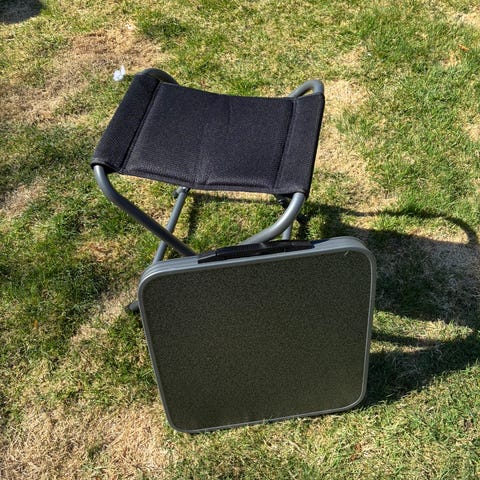 Vadderad pall med löstagbar bordsskiva. Användbar som avställningsyta eller extra sittplats.