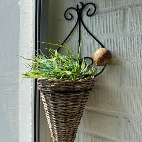 Väggampel i form av en konisk korg i flätad rotting med svart metallfäste för upphängning på vägg. Korgen är anpassad för plantering av mindre växter och passar för användning på balkong, altan eller inomhus mot vägg. Mått enligt bild med måttband, ungefärlig höjd runt 40 cm och bredd runt 20 cm. Metallfästet har dekorativ form och ger stabil upphängning.