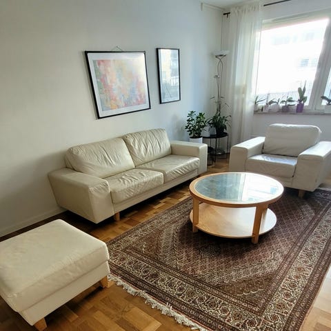 Vi säljer vår fina skinnsoffa från 60-talet. Soffan har en klassisk skandinavisk modern design och är i gott skick. Lädret har inga sprickor eller revor.