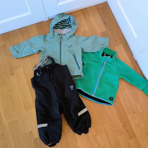 Skalset med byxa och jacka i storlek 80 även vindfleece i storlek 80.. adidas skor i storlek 20 i matchande färg samt vindfleece vantar och mössa i storlek 1-2 år.