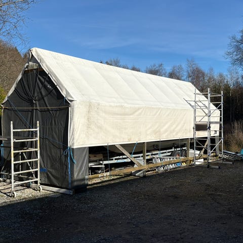 Säljer en stomme till ett båthus. Byggd av regelvirke 45x70 samt 50mm avloppsrör. Består av 5 takstolar, ben, fötter, jordspik, takfot/taknocks rör. Gavlarna har pressening på sig men är slitet och trasigt.