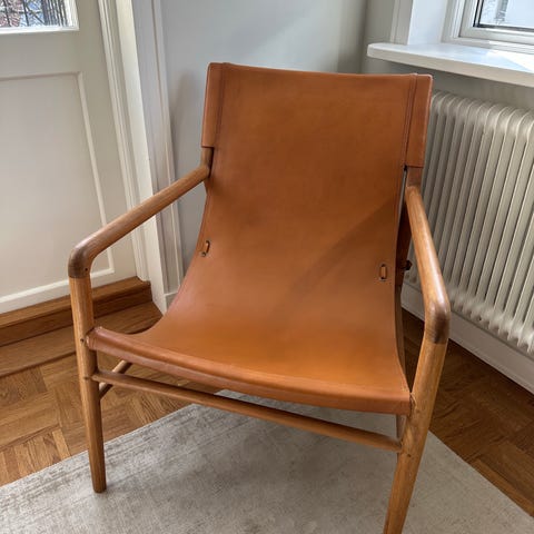 Superfin fåtölj i brunt skinn. Ritad av Gam Fratesi för Gubi. Modellen heter: Masculo Lounge Chair Sledge Base Black Matt.