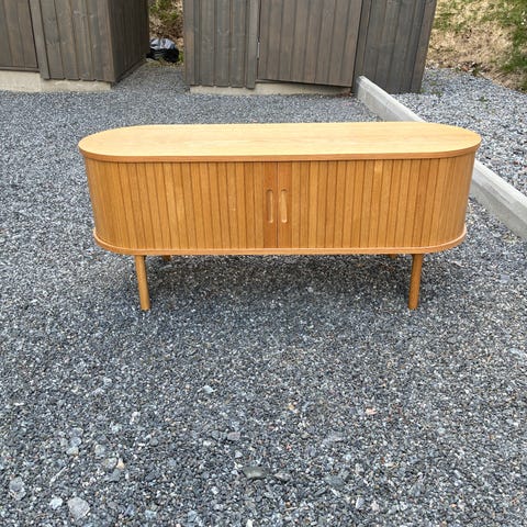 Tv-bänk från Jysk (Lyngvig ek) som är ca 1 år gammal. Skjutdörrar åt båda hållen samt 4 utrymmen med ett hål i botten för att lätt gömma tv-sladdarna.