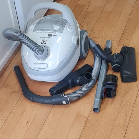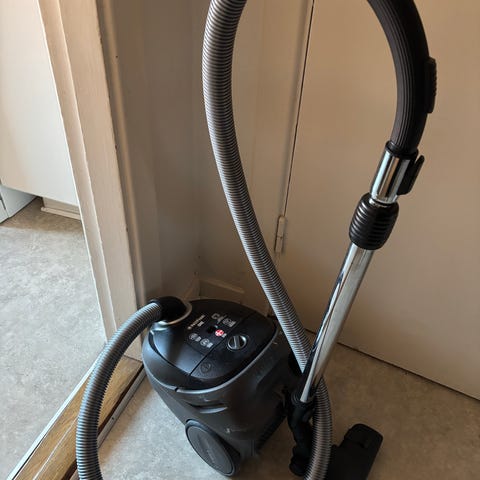 Electrolux PowerForce dammsugare i svart färg. Modell med justerbar sugstyrka via vred på ovansidan. Dammsugaren är utrustad med teleskoprör i metall, flexibel slang och två munstycke för olika golvtyper. På ovansidan finns knappar för start/stop och automatisk sladdvinda samt lucka för dammsugarpåse. Strömkabeln är integrerad i enheten med automatisk upprullning. Passar för normal städning av hem eller kontorsmiljö och sommarstuga. Modellspecifikationer och tekniska data finns på etiketten på baksidan av enheten. Medföljer en standardmunstycke och en extra munstycke för olika typer av golv och ytor. Dammsugaren är i gott skick och är rengjord på insidan och utsidan. En dammsugarpåse medföljer.