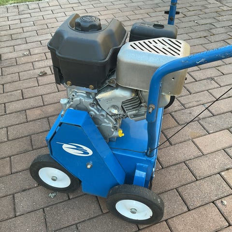 Bensindriven vertikalskärare för skötsel av gräsmatta. Maskinen är utrustad med handtag och hjul för enklare manövrering. Avsedd för att lufta och rensa gräsmattor från mossa och dött gräs i trädgård och andra grönytor.