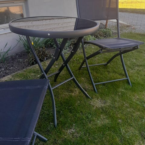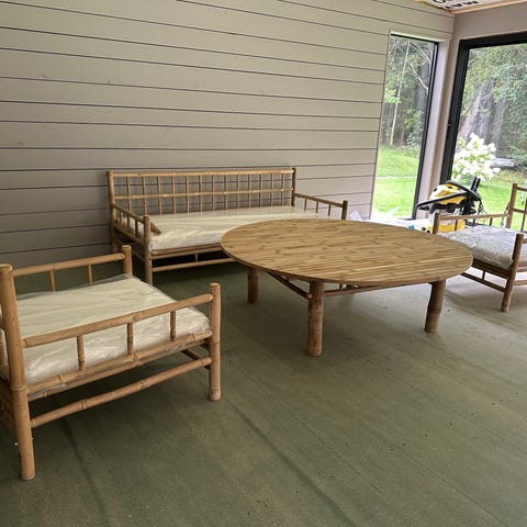 Lyxig Trädgårdsgrupp med rektangulärt bord och 5 fåtöljer. Möbeln är utförd brunlaserat trä med ribbad bordsskiva och sits/ryggstöd. Bordet har hål i mitten för parasoll. Passar för uteplats, altan eller trädgård. Sittdynor finns och kan följa med men de är slitna och trasiga. Finns i Hälleforsnäs. Fåtöljer kan fällas ihop.