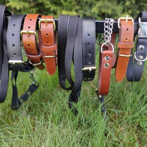 Equestrian Stockholm hundhalsband: Blå/grönt och ett brunt. Remmarna har metallbrickor med logotyp samt sömmar längs kanterna.