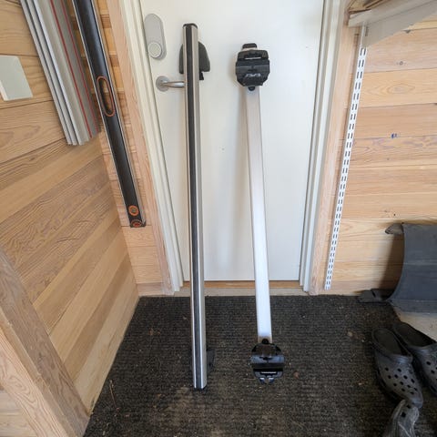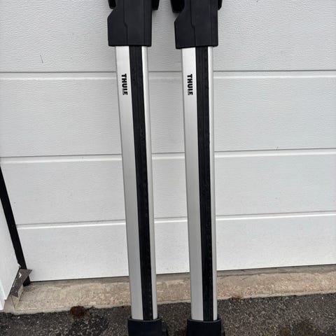 Škoda takräcken i aluminium med integrerade lås. Två tvärbalkar med svarta fötter, anpassade för montering på bilens tak. Levereras med nycklar och förvaringsväska med Škoda-logotyp. Lämpliga som bas för exempelvis takbox eller cykelhållare, beroende på bilmodell och tillverkarens rekommendationer.