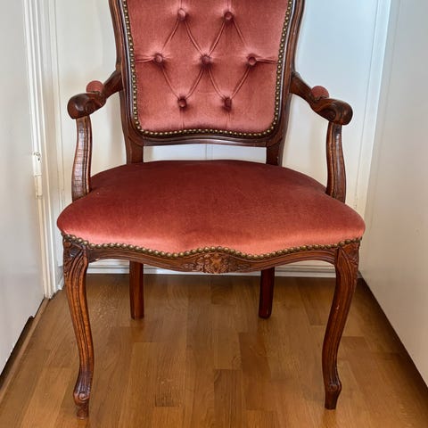 Fåtöljen är I bra skick den har mässinghjul ,stoppningen är bra och beklänaden hel men blek baksida.
