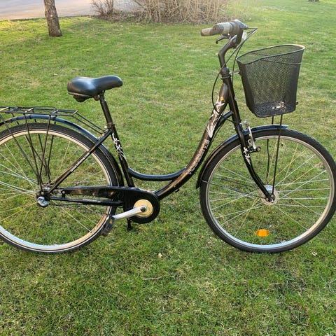 Stilig damcykel från det svenska fabrikatet Vega. Cykeln är utrustad med 3 välfungerande växlar, pakethållare och reflexer. Cykeln fungerar bra och är körklar.