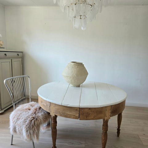 Vacker matgrupp från 60-talet. Bordet är runt med tillhörande inläggsskiva på 55 cm (i på bilderna). Utan iläggskiva är bordet ca 110 cm brett. Färgen kan behövas bättras på annars i bra skick.