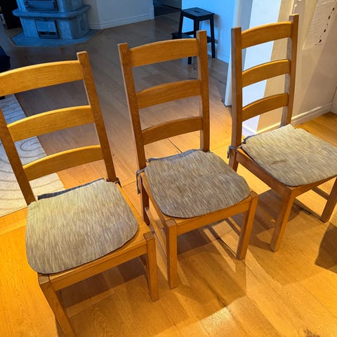 Stolarna har en varm träfinish och mjuka sitsar i tyg, vilket gör dem både bekväma och stilrena. Perfekta till matbord, kök eller lantlig/klassisk inredning.
