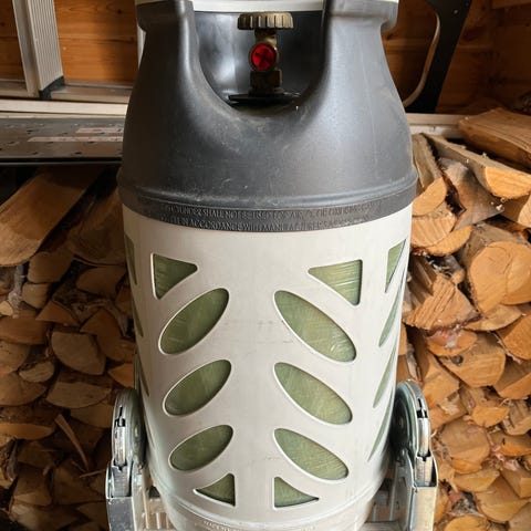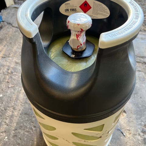 Gasolflaska i kompositmaterial. Flaskan har skyddande överdel och ventil upptill. Passar för gasol till exempelvis grill, husvagn eller båt, beroende på rätt anslutning och godkänd fyllning.