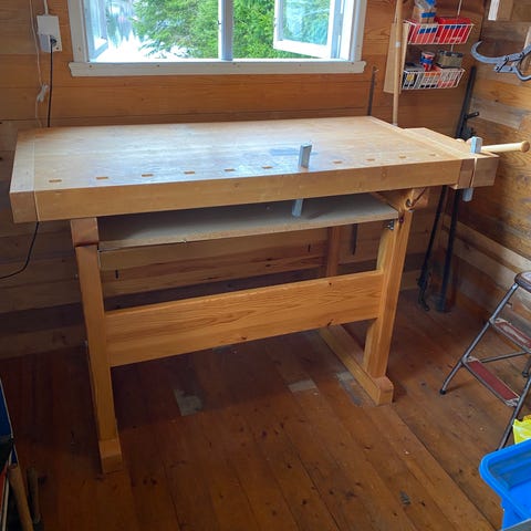 Snickarbänk i trä med kraftig arbetsyta och inbyggd skruvtving framtill. Bänken står på stabilt trästativ och har urtag och hål i skivan för fastspänning av arbetsstycken. Passar för snickeri- och hobbyarbeten i verkstad, garage eller hobbyrum.