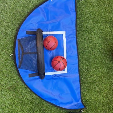 Rund gunga med blå sits och svart ram. Gungan har upphängningsrep med metallringar för montering. Avsedd för utomhusbruk, exempelvis i trädgård eller på lekplats, och kan hängas upp i en stabil gren eller gungställning.