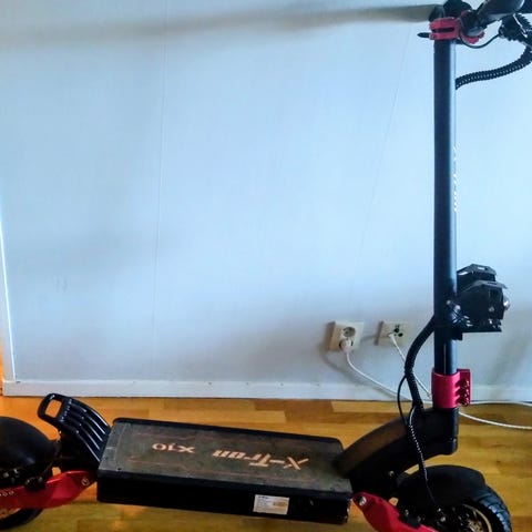 Scrooser elsparkcykel i svart med röda detaljer. Utrustad med digital display vid styret som visar hastighet och annan körinformation. Modellen har bred fotplatta, dubbla strålkastare fram och skivbromsar. Passar för pendling och kortare transporter på cykelvägar och liknande underlag. Drivs av elmotor och laddningsbart batteri.