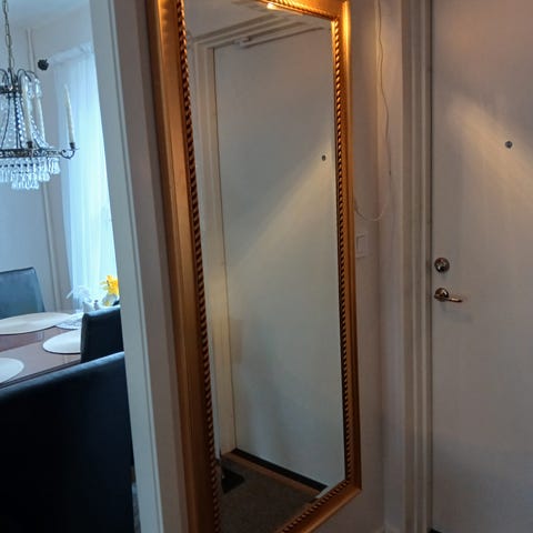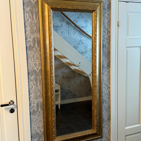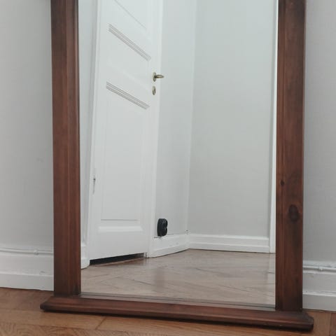 &Tradition spegel med träram. 82x64 cm. Rektangulär spegel med överdel i form av en indelad träsektion. Träramen har en varm träton och kan användas exempelvis i hall, sovrum eller vardagsrum. Spegeln kan lutas mot vägg eller monteras upp beroende på önskemål och upphängningslösning.
