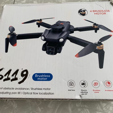 Le-Idea Idea 1 fjärrstyrd drönare med tillhörande handkontroll. Drönaren har fyra rotorer med skydd runt propellrarna och levereras i originalförpackning. Paketet innehåller drönare, fjärrkontroll och användarmanual. Modellen är avsedd för fjärrstyrd flygning och drivs av uppladdningsbart batteri i drönaren samt batterier i handkontrollen (se manual för specifika batterityper och laddningsinstruktioner). Produkten är märkt med nödvändiga varningar och säkerhetsanvisningar, bland annat att den inte är lämplig för barn under 14 år utan uppsikt av vuxen. Plasten för att täcka batteriet är lite sönder i sista bilden, men funkar fortfarande helt bra.