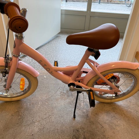 Säljer Stoy barncykel i storlek 14" rosa. Vi har haft den parkerad i garage. Cykeln har fotbroms bak och handbroms fram, kedjeskydd samt reflexer på hjul och pedaler. Passar barn i åldrarna 4-6. Det finns lite rost här och där men den funkar utmärkt