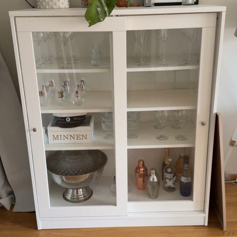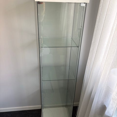 Säljer ett vitt BRIMNES vitrinskåp i fint skick. Stilren förvaring med glasdörrar och flyttbara hyllplan.