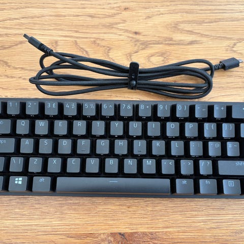 Attack Shark X68 HE tangentbord med RGB-belysning. Kompakt layout med numeriska tangenter borttagna för mindre format. Levereras med avtagbar kabel, verktyg för tangentborttagning, handledsstöd/rem med Attack Shark-logotyp samt dokumentation och klistermärken. Tangentbordet är avsett för användning med dator och har bakgrundsbelysta tangenter med flerfärgad RGB-effekt.