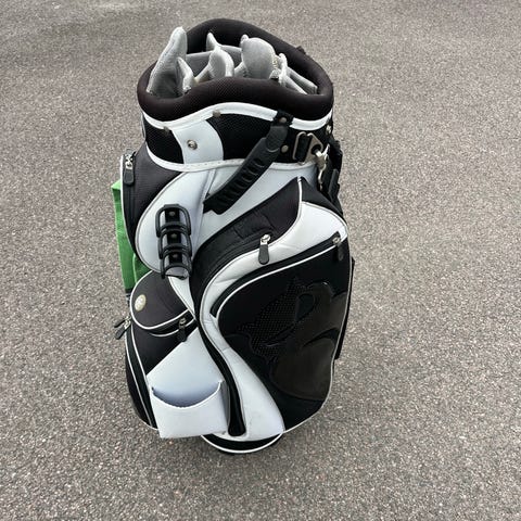 Spalding golfbag i svart och vitt. Klassisk modell med flera fack för klubbor i toppen och bärrem på sidan. Utrustad med ytterfack med dragkedja för tillbehör samt metallöglor för upphängning av handduk eller andra golfaccessoarer. Passar för förvaring och transport av golfklubbor på bana eller range.