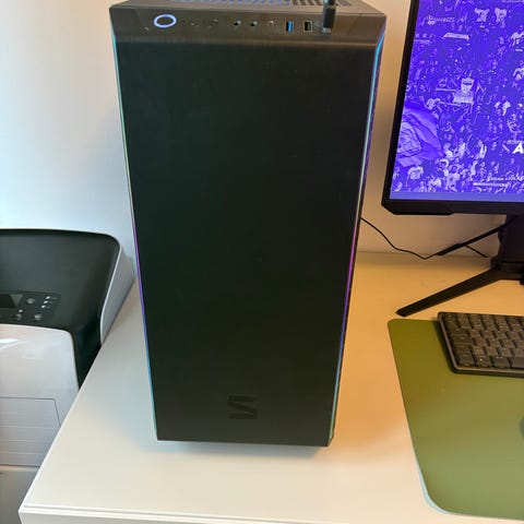 Säljer en snygg stationär gamingdator med RGB-belysning och genomskinlig sidopanel – ser riktigt cool ut på skrivbordet.