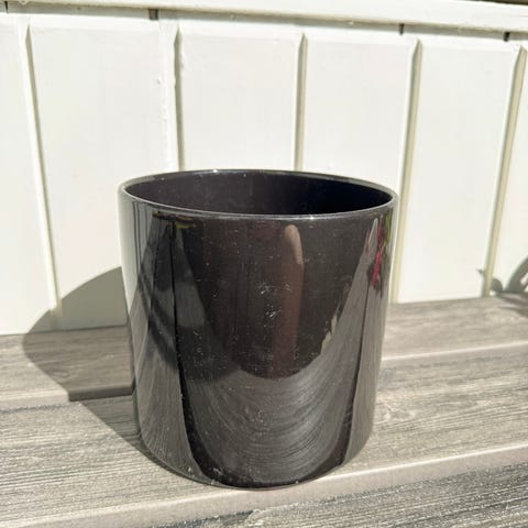 Rund vit kruka med vertikala fält längs sidorna. Höjden är cirka 20 cm och diametern upptill är cirka 20 cm. Passar för plantering av mindre växter inomhus eller utomhus. Krukan har slät insida och lätt utsvängd kant upptill.