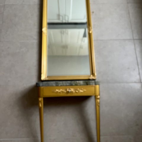 Spegel med tillhörande konsolbord i brunt trä. Spegeln har en hög, rektangulär form med profilerad överdel och dekorativa detaljer. Konsolbordet har svängda ben och utskuren dekor under bordsskivan. Passar exempelvis i hall, vardagsrum eller sovrum som avlastningsyta och spegelkombination mot vägg.