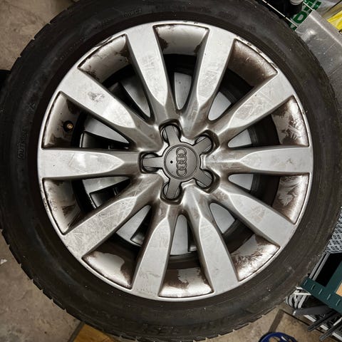 Säljer av en uppsättning med däck på aluminium fälgar från märket Volkswagen däcken är från Continental