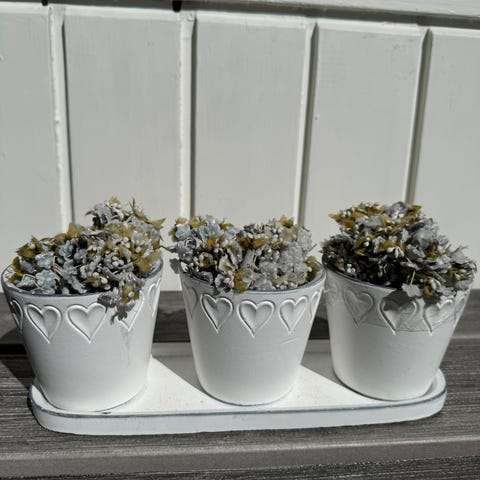 3st krukor i vit keramik med rektangulär dekor med blommotiv på framsidan. Höjd cirka 12 cm och diameter cirka 13 cm upptill. Passar som ytterkrukor för mindre växter inomhus eller utomhus under tak. Säljes som set om tre likadana krukor.