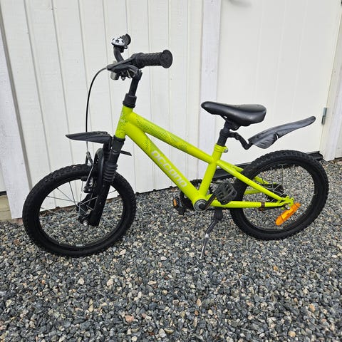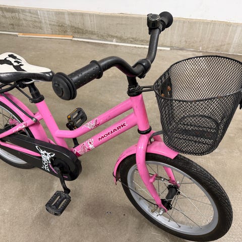 Occano barncykel med 16" hjul. Cykeln har vit ram med rosa detaljer, fotbroms bak och handbroms fram. Utrustad med korg fram, pakethållare bak, skärmar och kedjeskydd. Passar barn som är redo för en mindre barncykel med 16-tums hjul för vardagscykling och lek.