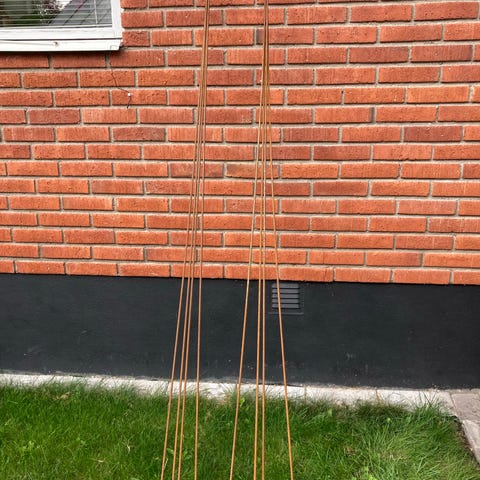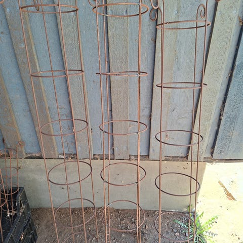 Växtstöd 3 stycken i metall, målade i grönt. Väggmodell. Lämpliga att använda i trädgårdsland, rabatter eller mot vägg för att hålla växter upprätta och ge dem möjlighet att klättra. Höjd 150 cm, bredd 25 cm, djup 16,5 cm.