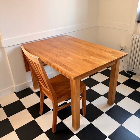 Ommålat bord med fyra stolar . Bordet kan förlängas . Bordsskivan har målarfärg och en del hack och repor. (Se bild) Annars bra skick, stabilt men behöver ny färg. Mått utan förlängning, Längd 120 cm med förlängningen 170 cm och bredden 80 cm.